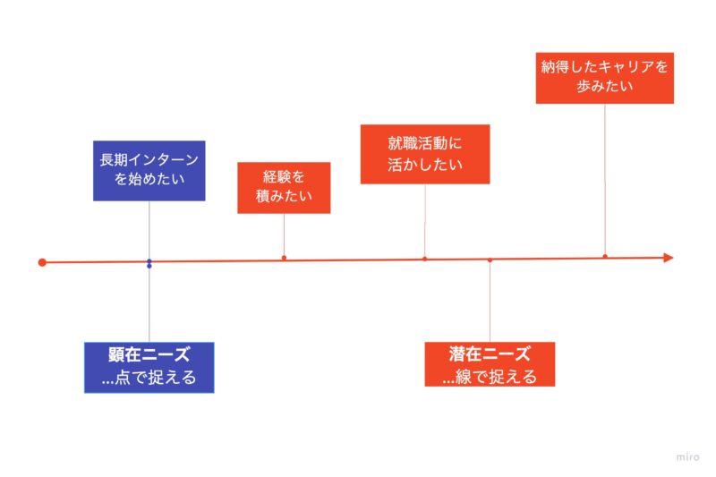 つまり、私たちは「長期インターンを始める」という点でニーズを捉えるのではなく、「長期インターンの活動を通して学びたい・就活に活かしたい」という線でのニーズで捉えました。